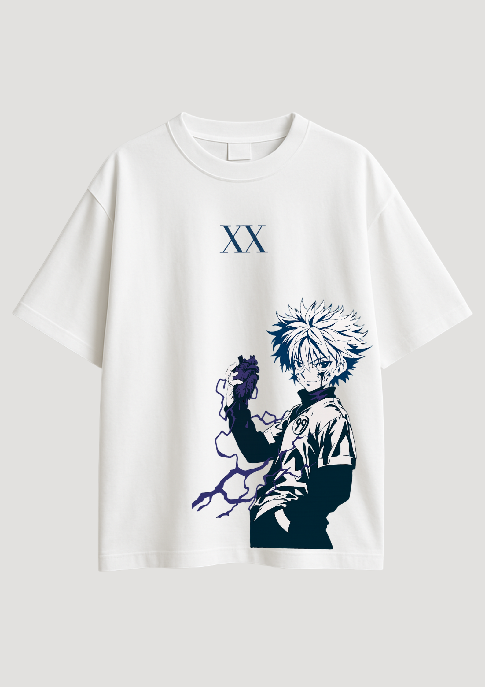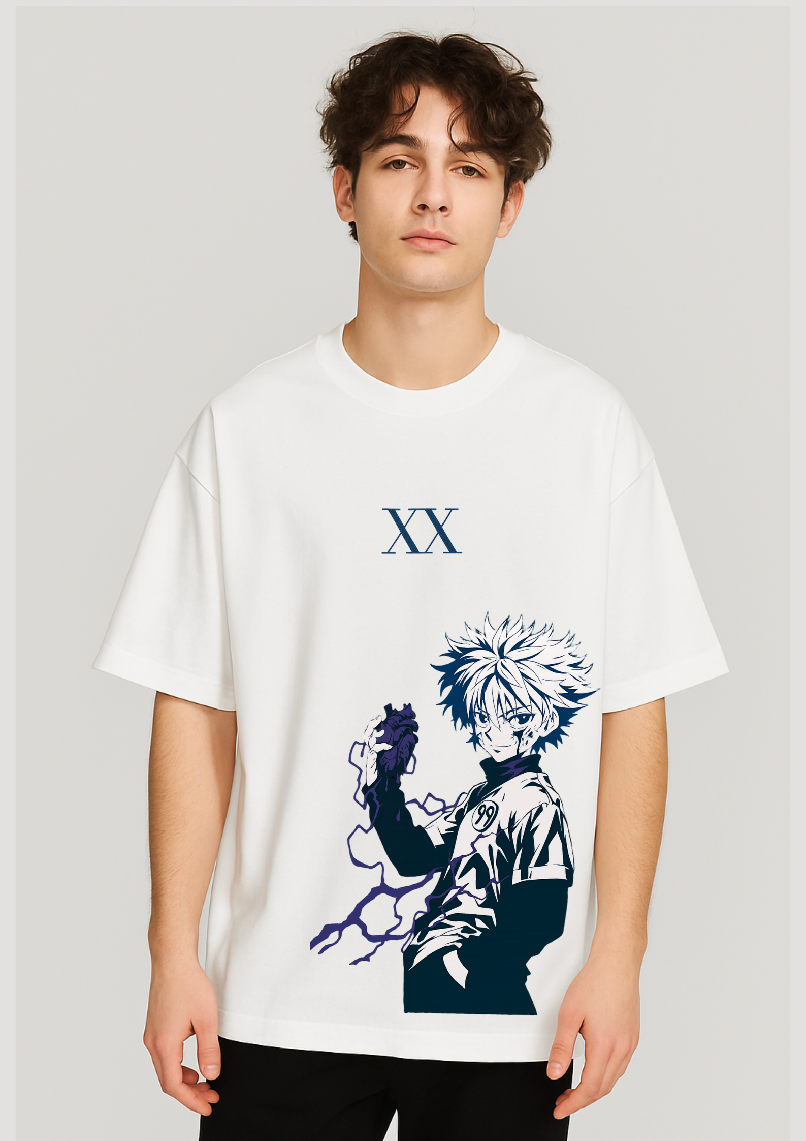 Drop into the world of assassins and electricity with the Killua XX Oversized Tee—a tribute to the cold-blooded charm of Killua Zoldyck from Hunter x Hunter. This piece fuses anime intensity with streetwear heat, featuring a bold monochrome print with electric purple crackles that feel as dangerous as they look.